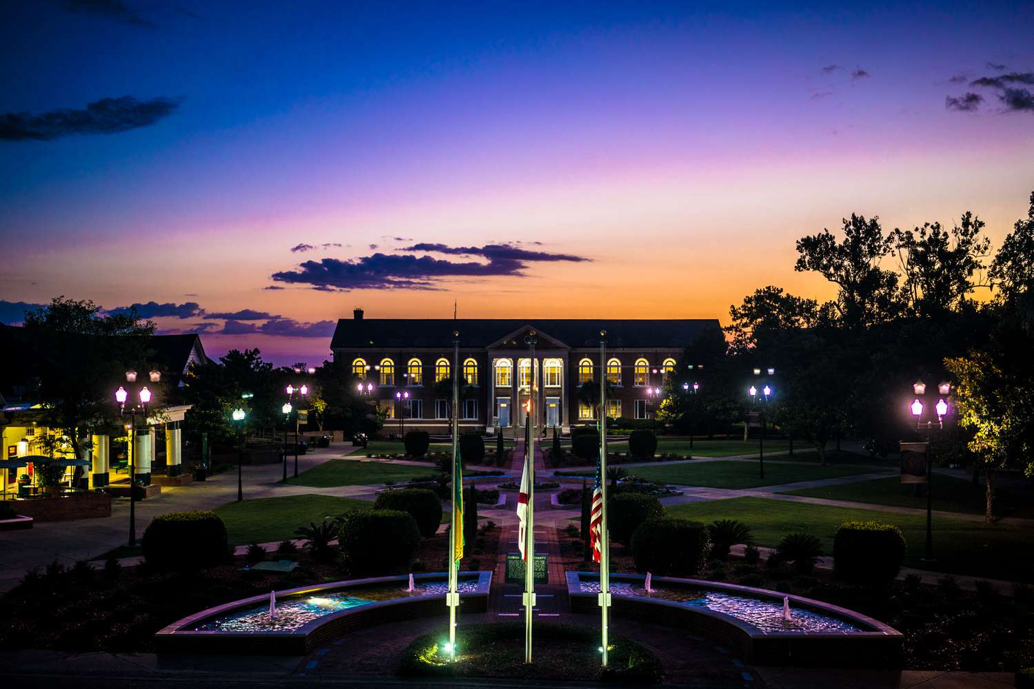An overview of a university campus with students walking